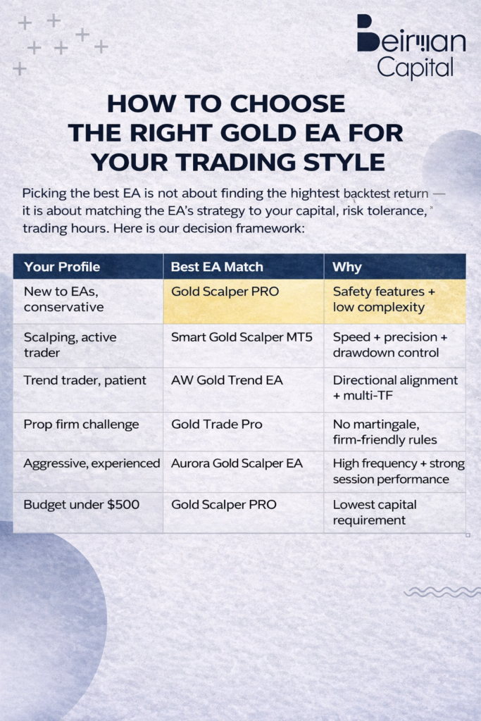 At Beirman Capital, we put 12 popular gold EAs through 90 days of live XAUUSD testing. We tracked drawdown behaviour, win rate, execution speed, spread sensitivity, and — critically — how they handled the high-volatility periods that dominated Q1 2026. Only 5 made our final list.