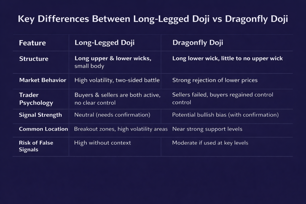 Not all dojis carry the same weight. Long-legged and dragonfly doji reveal deeper market behaviour like volatility, rejection, and liquidity shifts.
