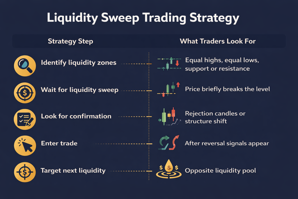 Many traders place stop losses slightly beyond the sweep level and aim for the next area where liquidity may exist.